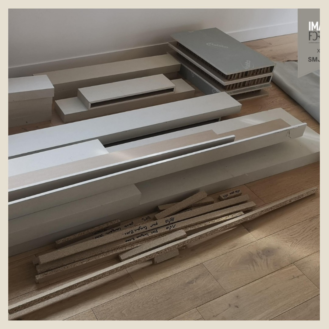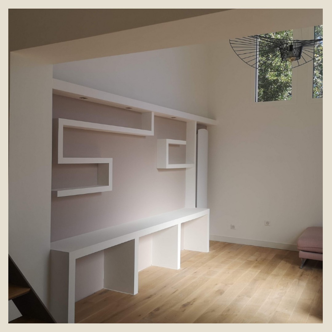 Pour ce projet résidentiel, nous avons imaginé et fabriqué un meuble en plaques de plâtre intégrant des cloisons séparatives et décoratives. L’objectif était de structurer l’espace tout en conservant une grande fluidité. Chaque élément a été pensé pour allier praticité et esthétique, offrant à la fois des rangements et un véritable atout décoratif. Le sur-mesure a permis d’adapter parfaitement le meuble aux contraintes du lieu. Le résultat final apporte confort, modernité et élégance au quotidien.