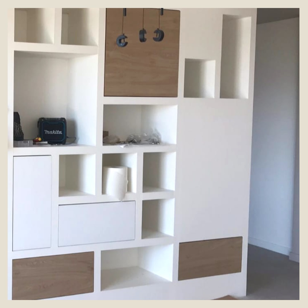 Pour ce particulier, IMAFORM a conçu un module décoratif entièrement sur mesure. L’originalité du projet repose sur l’association de deux matières : le plâtre et le bois. Ce mariage apporte un contraste élégant entre sobriété et chaleur naturelle. L’intégration précise des matériaux assure une finition soignée et harmonieuse.