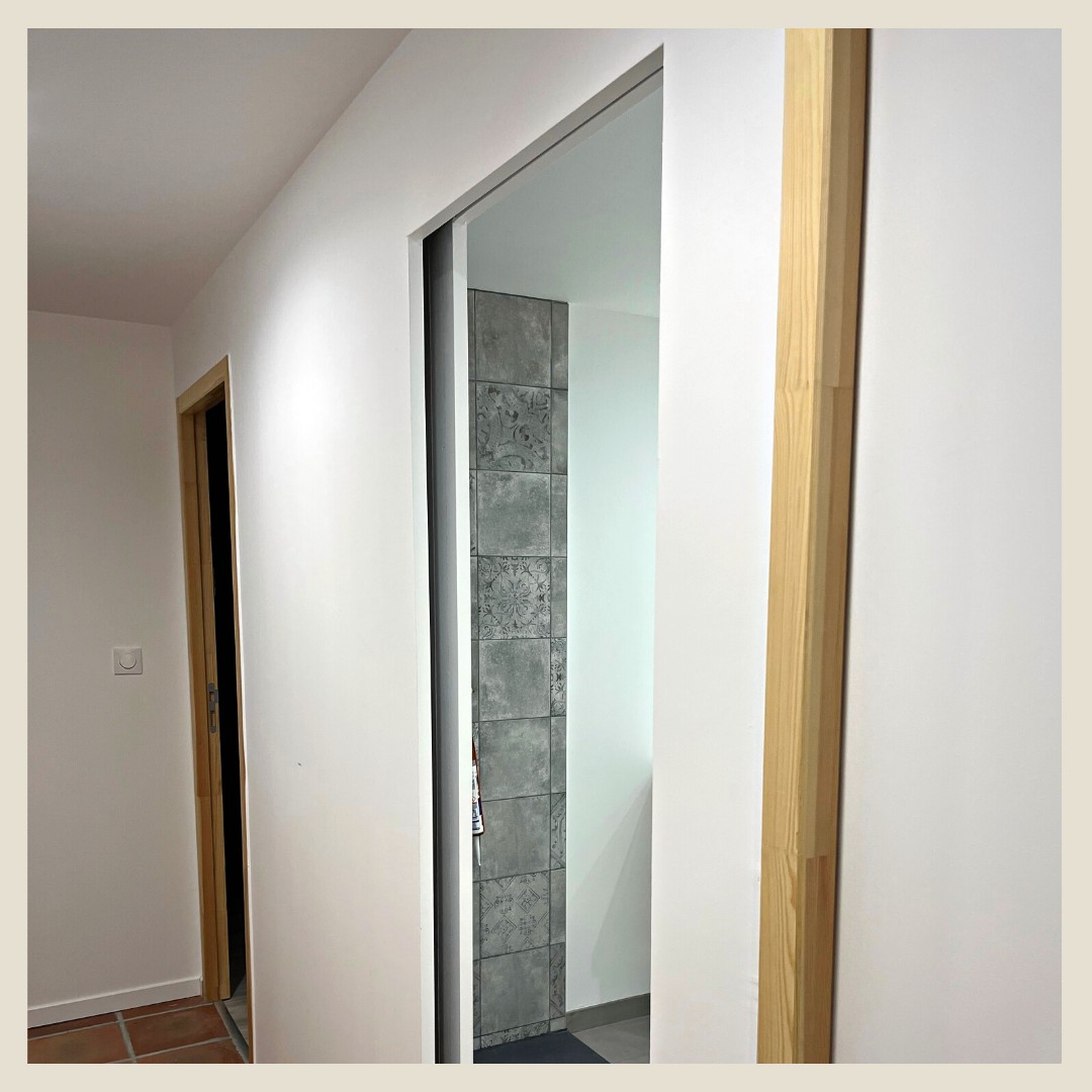 Résultat : une porte totalement invisible, qui se fond parfaitement dans son environnement. Ici, installée à l’entrée d’une salle de bain, elle allie design épuré et fonctionnalité.
