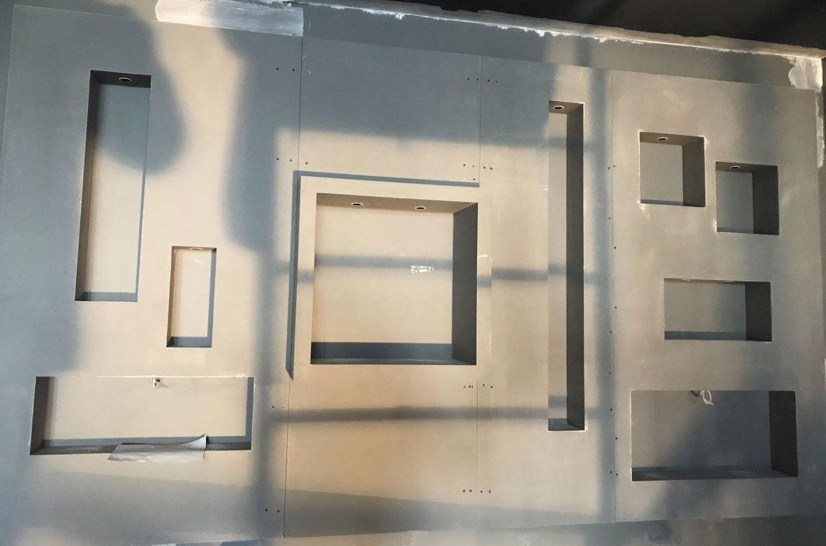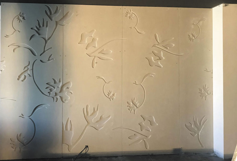 Modules d’agencement mural sur mesure, plafond aux formes géométriques circulaires et gravure décorative inspirée d’un design contemporain